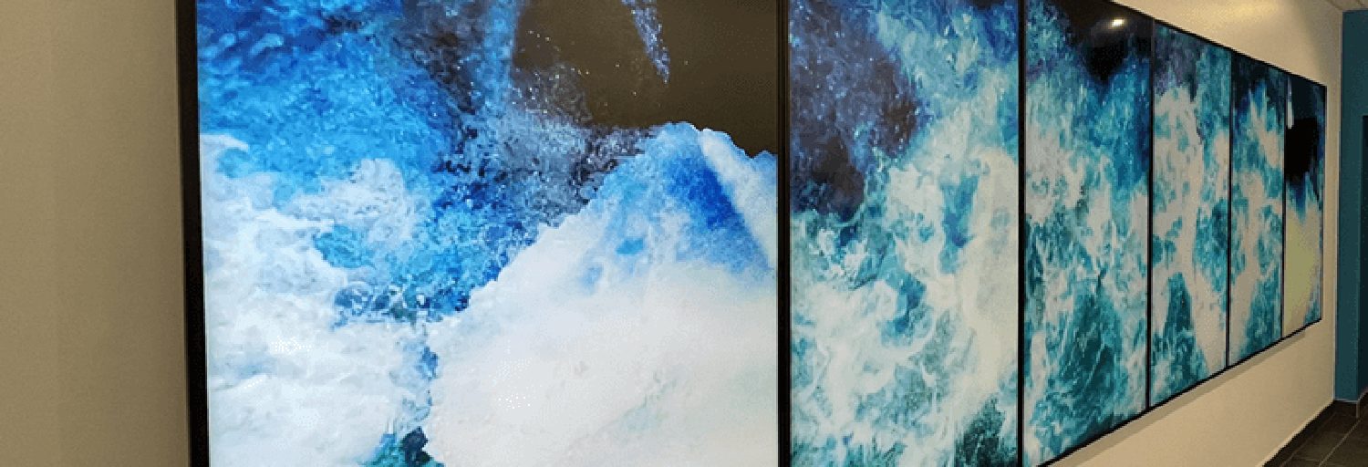 La démarche artistique d’Étienne St-Amant conjugue le passé au présent. Celle-ci prend racine dans le roc d’un quartier bercé par les flots de la rivière. Inlassablement, l’œuvre s’anime sur le mur-écran du rez-de-chausée. Dans un doux tourbillon bleuté, elle insuffle son rythme et sa poésie. Ainsi, la Place-Griffith renait et s’érige fièrement sur les rives de la rivière Magog.